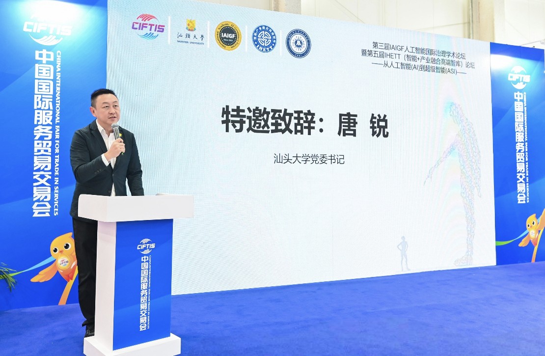(上图:汕头大学党委书记唐锐在特邀致辞指出,作为IAIGF的创始发起主办单位,汕头大学将发挥桥梁纽带作用,为全球人工智能治理贡献中国智慧和高校力量)